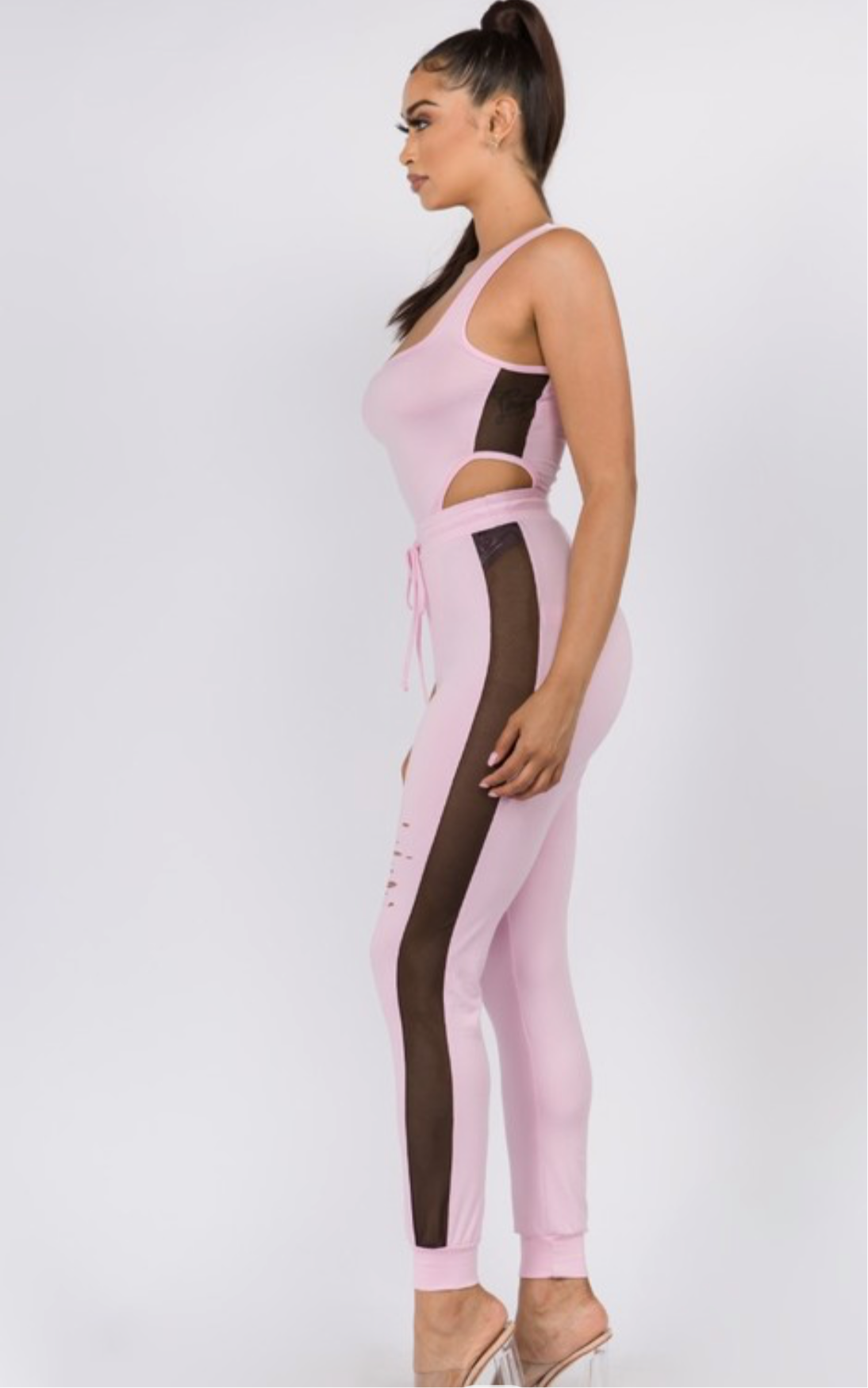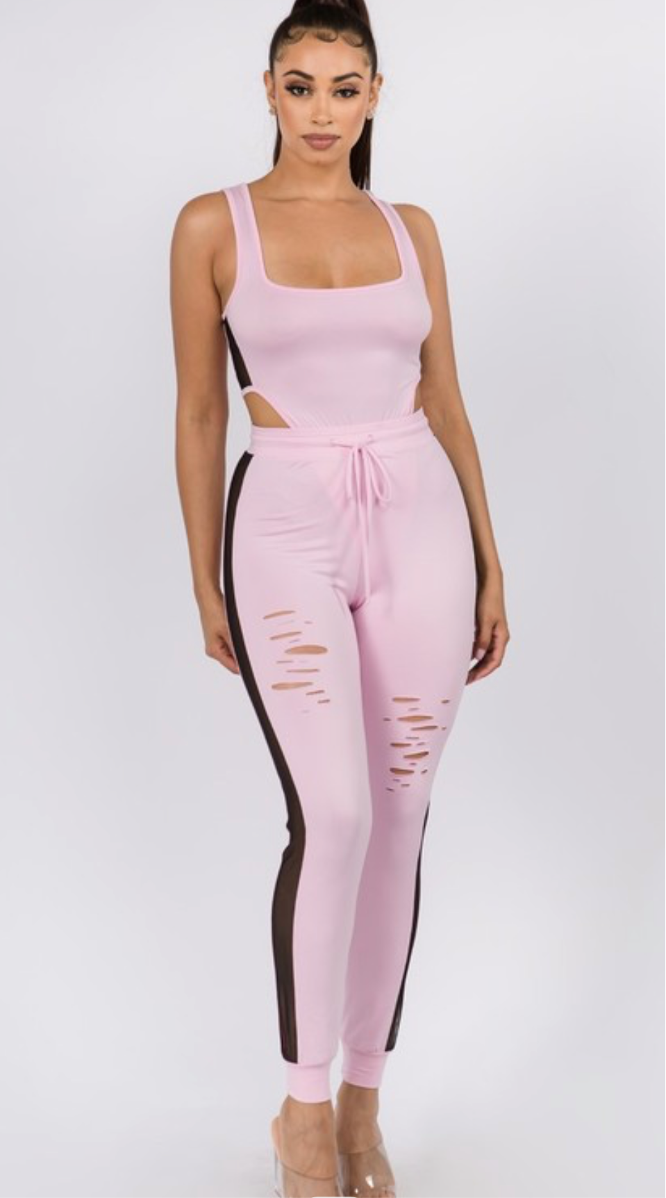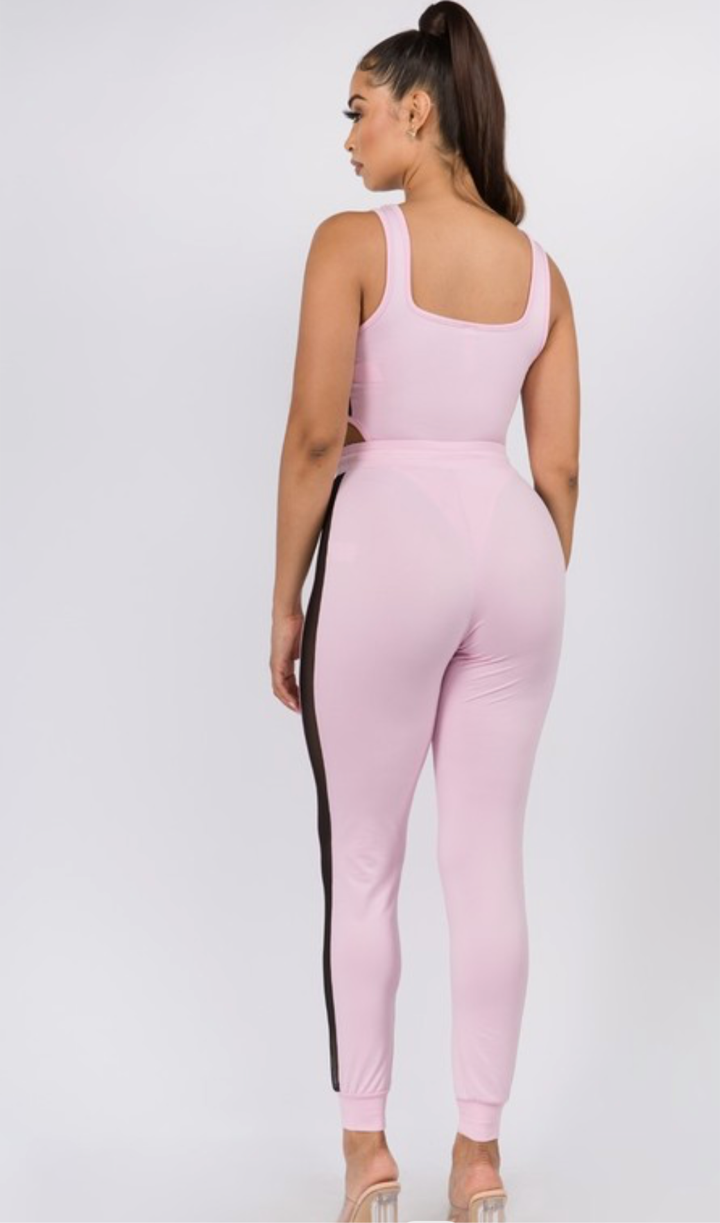 baby pink bodysuit and jogger pants