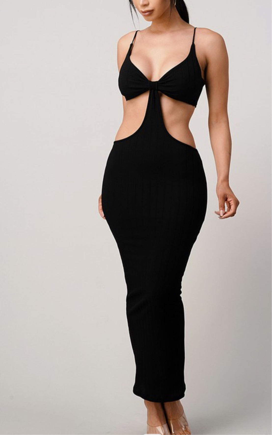 V neck spaghetti strap front tied knot cut out ribbed midi length dress