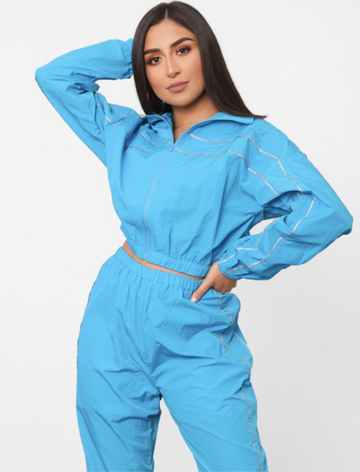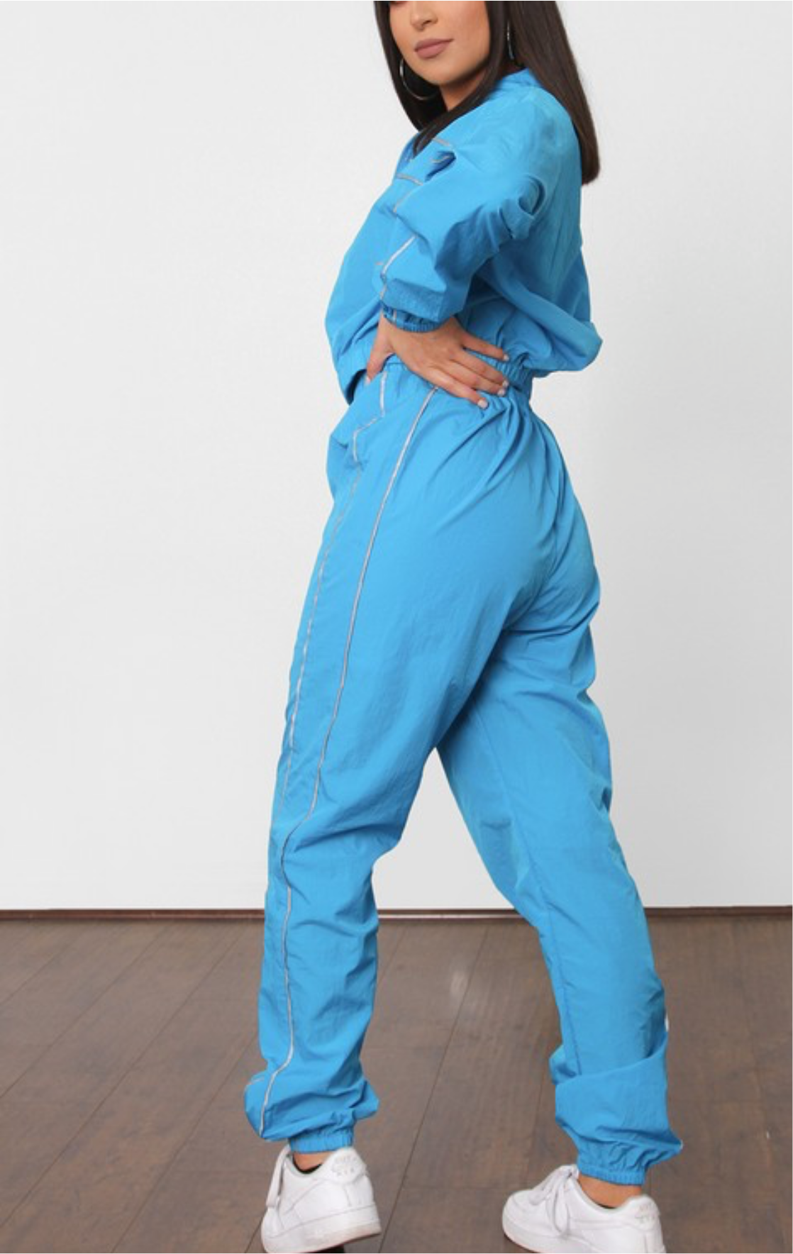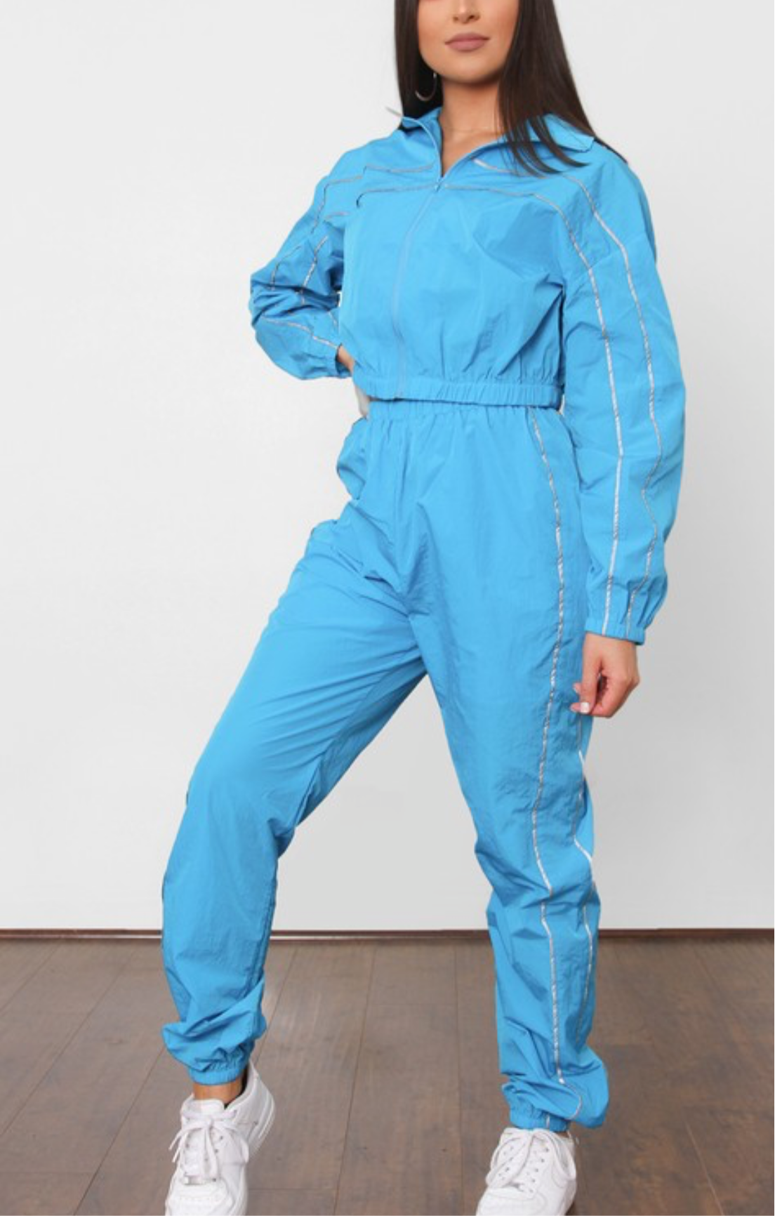 Two piece track set with reflective lines on jacket and pants . No stretch