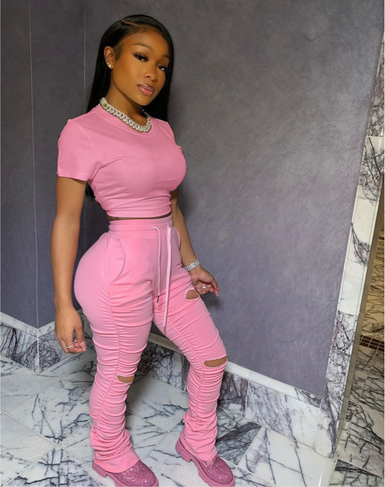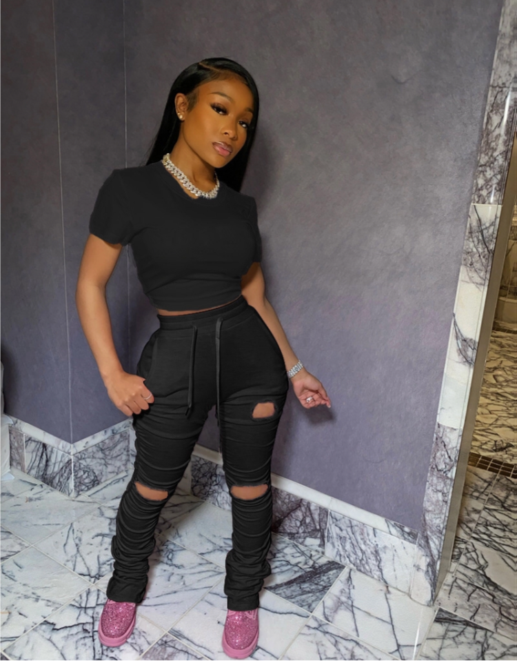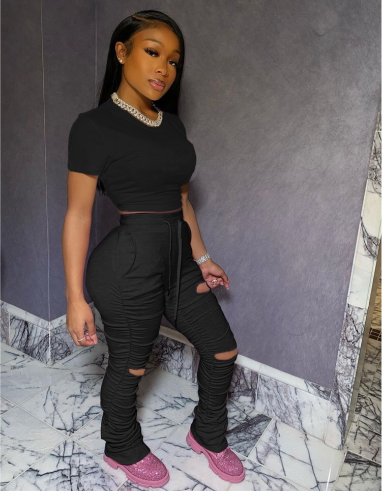 Solid stacked holes short sleeve two piece set pants set